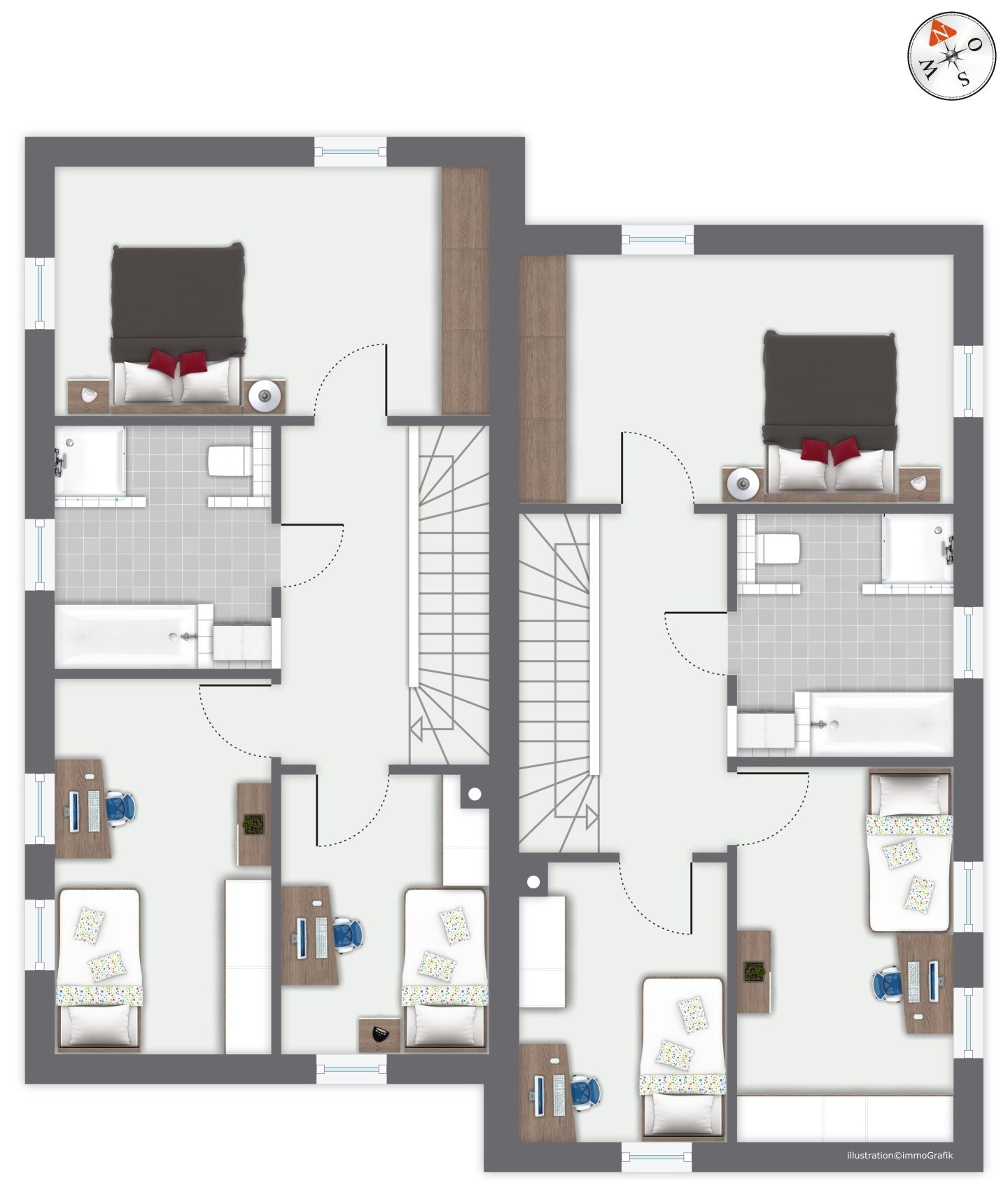 Im Obergeschoss erwartet Sie ein großzügiges Familienbad mit Badewanne und Dusche, ein Elternschlafzimmer sowie zwei weitere Räume, die sich ideal als Kinderzimmer, Homeoffice oder Gästezimmer nutzen lassen.