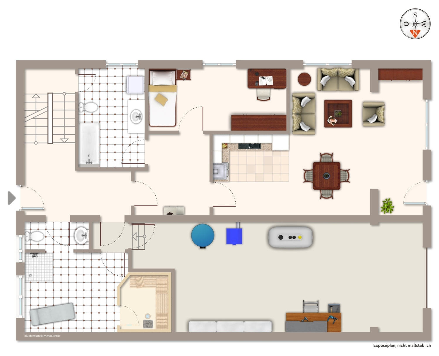 Das Objekt besteht aus drei Etagen, wobei aus dem Dachgeschoss noch der ausgebaute Spitzboden erschlossen wurde. Der ehemalige Eigentümer hat eine Teilsanierung durchgeführt. Hieraus ergeben sich drei abgeschlossene Wohnungen. Neben den drei Wohnungen bietet die Immobilie noch eine große Werkstatt, die auch als Bootsgarage genutzt wurde. Im Erdgeschoss befindet sich ebenfalls noch eine Sauna.