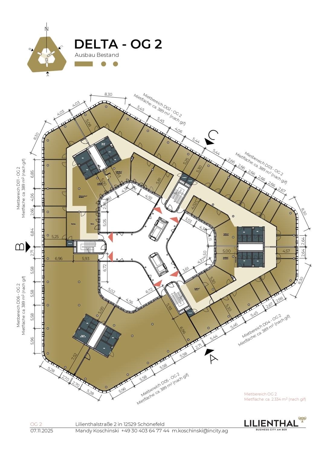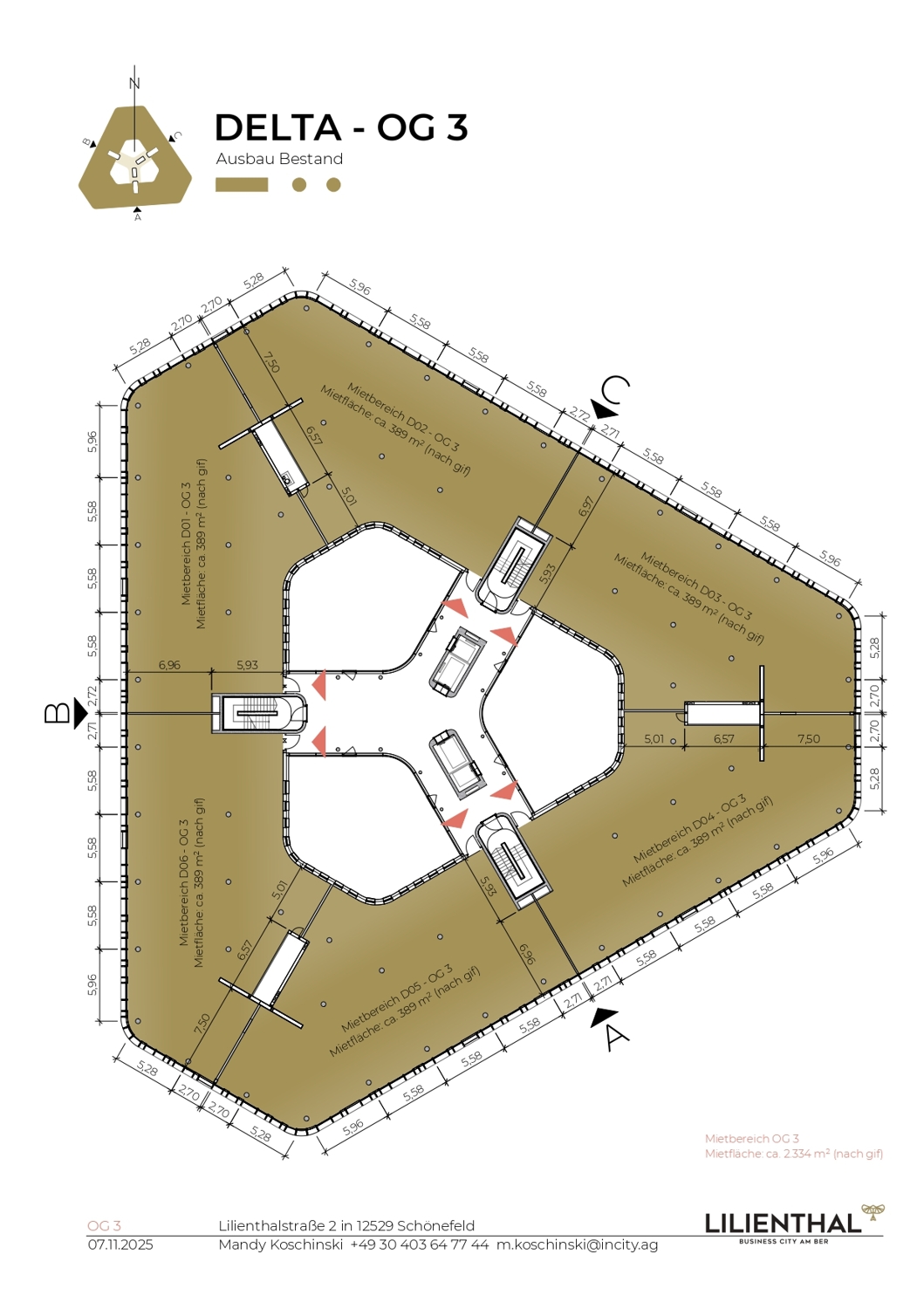 Dieser markante Neubau in der Lilienthalstraße 2 in Waltersdorf zieht bereits aus der Ferne alle Blicke auf sich. Auf fünf Etagen gruppieren sich rund um drei begrünte Innenhöfe insgesamt 11.655 m² flexibel nutzbare Büroflächen, die sowohl luxuriös als auch funktional gestaltet sind. Die Flächen sind teilbar ab 350 m² und bieten damit Unternehmen jeder Größe die Möglichkeit, ihre individuellen Raumkonzepte zu realisieren – vom offenen, kollaborativen Workspace über klassische Einzelbüros bis hin zu repräsentativen Großraumbüros. Großzügige Raumhöhen, raumhohe Glasfronten und ein effizienter, außenliegender Sonnenschutz sorgen für maximalen Lichteinfall aus allen Himmelsrichtungen und ein angenehmes Raumklima, während die hochwertige Bauweise den DGNB Gold Standard erfüllt und Nachhaltigkeit, Energieeffizienz sowie höchste Aufenthaltsqualität garantiert.