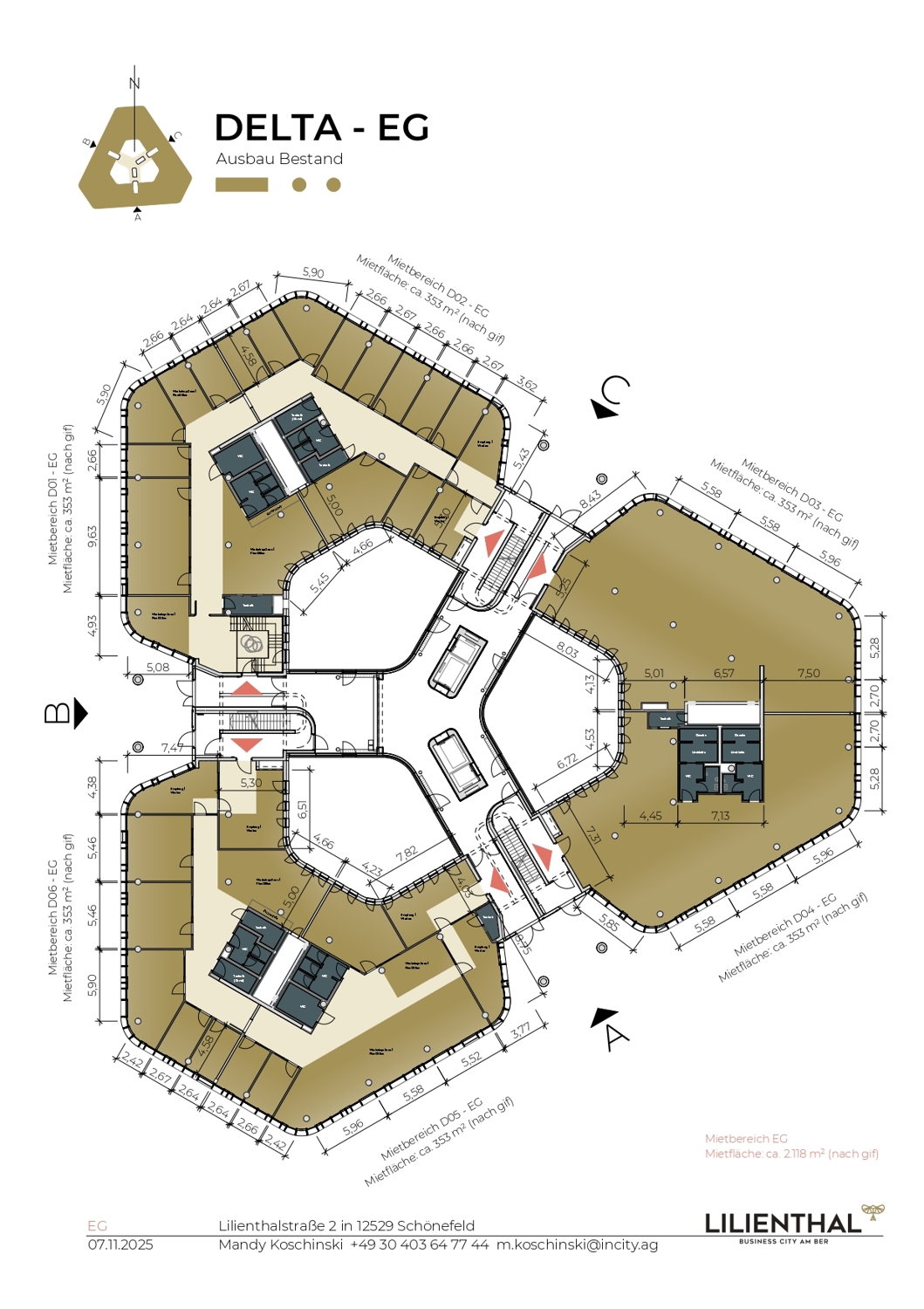 Das Delta-Gebäude befindet sich in der Lilienthal Business City in Schönefeld, nur wenige Minuten vom Flughafen Berlin Brandenburg (BER) entfernt und damit in einer der dynamischsten und wachstumsstärksten Gewerberegionen südöstlich von Berlin. Die Lage überzeugt durch maximale Sichtbarkeit und hervorragende Erreichbarkeit, sowohl für Kunden und Geschäftspartner als auch für Mitarbeiter. Die Anbindung an das überregionale Straßennetz ist ideal: die Autobahnen A113 und A117 sind in nur einer Minute erreichbar, das Berliner Stadtzentrum in etwa 25 Minuten, und der Flughafen BER liegt lediglich fünf Minuten entfernt.
